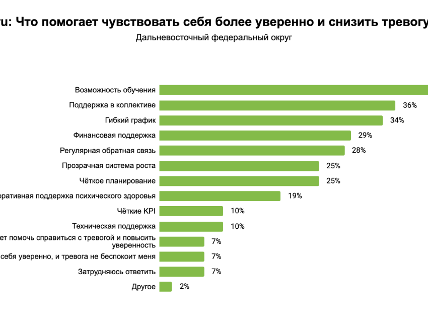 При этом почти все знают, что может помочь им избежать беспокойства. Наиболее действенным вариантом жители Дальнего Востока считают возможность обучения (45%), оно помогает бороться со страхом обесценивания навыков и повышает уверенность в будущем. Кроме того, часто называли поддержку в коллективе (36%), которая снижает страх конфликтов, изоляции и токсичной среды, и гибкий график, он помогает бороться со страхом потери work-life balance и выгорания (34%).