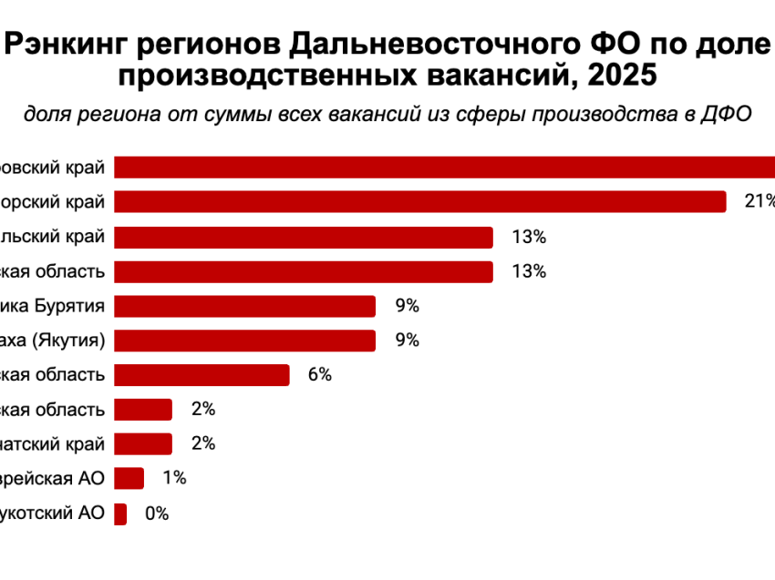 По итогам ноября на первое место по уровню спроса на производственный персонал на Дальнем Востоке вышел Хабаровский край, на него приходится 25% от всех открытых в ФО вакансий из данного направления. На втором месте — Приморский край (21%), на третьем — Забайкальский край (13%). Далее — Амурская область (13%), Республика Бурятия, Якутия (по 9%), Сахалинская область (6%), Магаданская область, Камчатский край (по 2%), Еврейская АО (1%) и Чукотский АО (менее 1%).