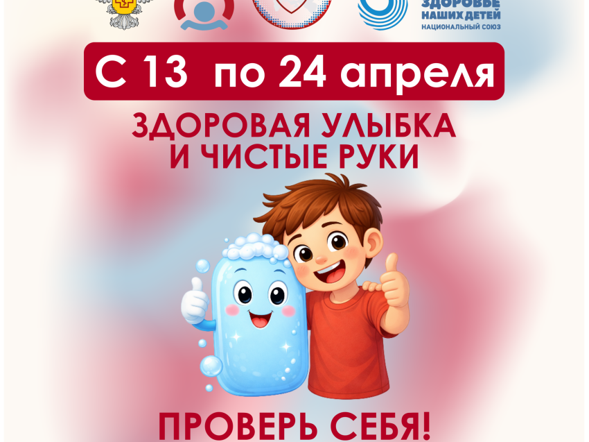 С 13 по 24 апреля 2026 года Роспотребнадзор проводит первый этап Всероссийской санитарно-просветительской акции «Диктант здоровья» – «Здоровая улыбка и чистые руки». Он посвящён двум важнейшим компонентам личной гигиены, которые являются основой профилактики множества заболеваний: